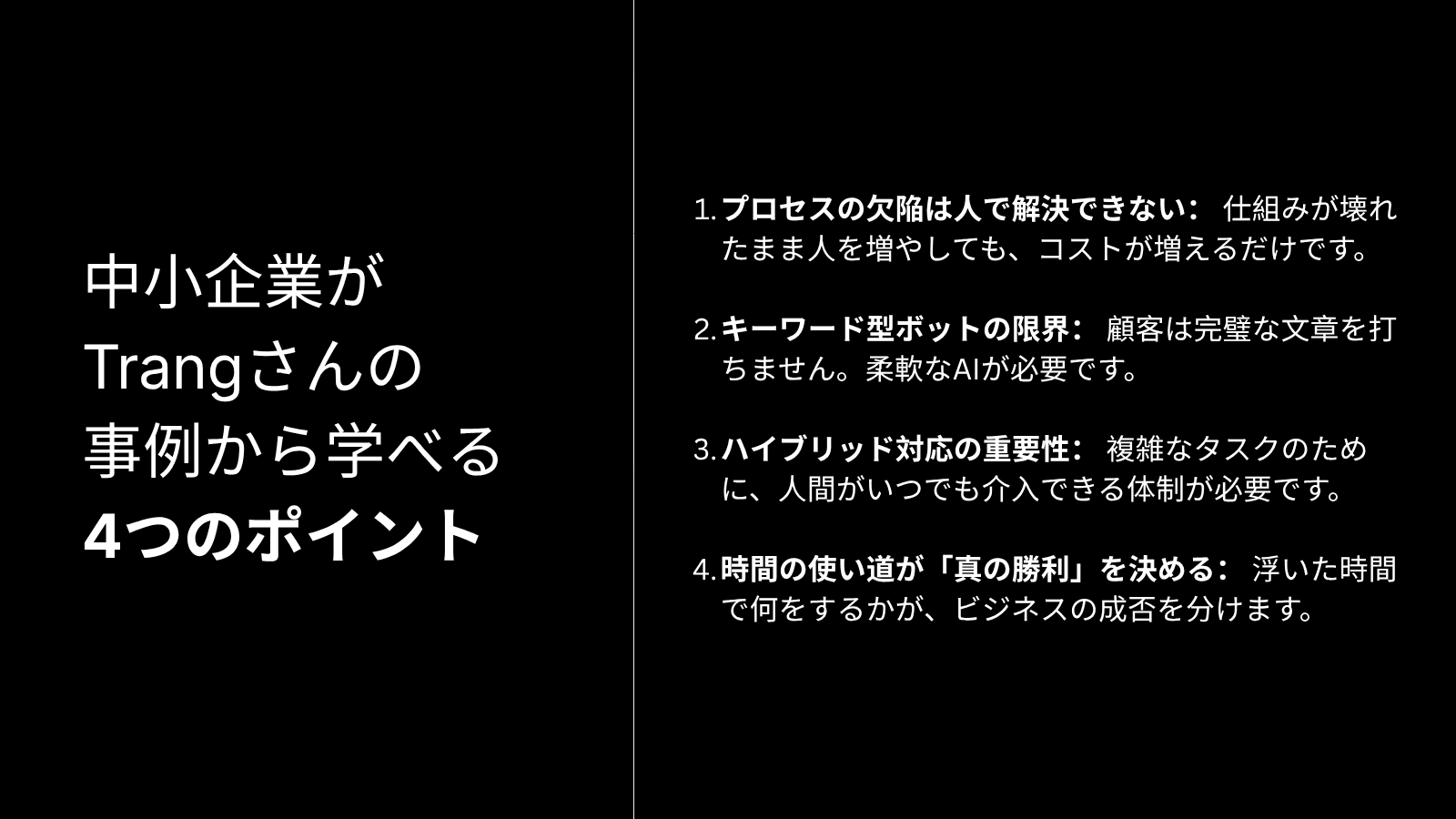 Trangさんのエピソードは、単にチャットボットを導入した話ではありません。「燃え尽きることなく、ビジネスをスケールさせる方法」を見つけた物語です。